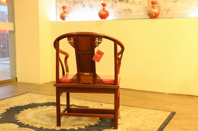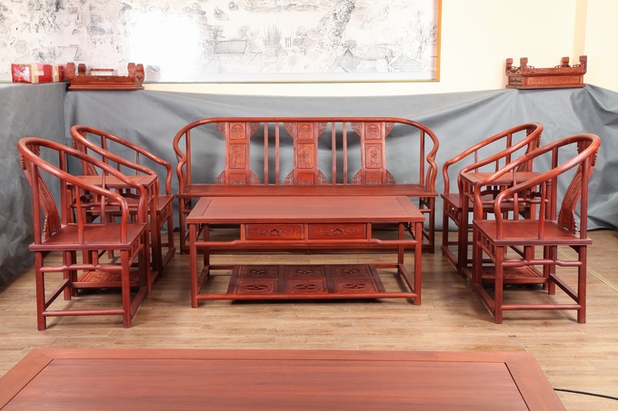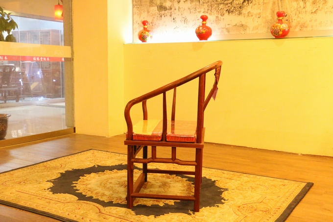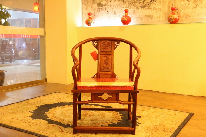 先來(lái)看看單人位沙發(fā)——圈椅,此圈椅沿襲了明代遺風(fēng),總體柔婉流暢的線(xiàn)條,顯露出設(shè)計(jì)者巧思之美;而少見(jiàn)的不出頭扶手直接與鵝脖相卯合,給人以纖秀雅巧的感覺(jué);加上優(yōu)質(zhì)的緬甸花梨木作為用材,使較易損壞的椅圈也更顯牢固堅(jiān)硬,兼具了形態(tài)之美與優(yōu)秀的做工的同時(shí),還擁有著良好的用材,優(yōu)美優(yōu)質(zhì)。雕飾圖案上的內(nèi)容包括有:在靠背板處的上方——一輪外圓框鑲嵌而內(nèi)的艷麗的牡丹花紋飾作為點(diǎn)綴,昭顯著”富貴”與”祥和”之瑞氣;中間位置還有——一株插在瓶器中的花草清野以及一矮小型的長(zhǎng)青株卉,透露出一股淡淡的青草氣息,花香悠長(zhǎng),自然生氣;另外在其靠背板上下的左右兩側(cè)以及券口牙子部分還雕飾有些許簡(jiǎn)單的鏤空紋飾作為處理,給整體營(yíng)造出一種典雅的中國(guó)風(fēng)氣息感受,細(xì)膩而又含蓄。