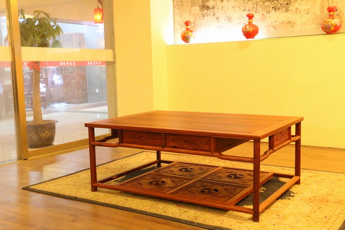 另外該套沙發(fā)同樣是為了滿(mǎn)足其人們實(shí)用性的需求,在大平幾的上方特別精心設(shè)計(jì)了左右兩格抽屜,方便了人們平時(shí)使用時(shí)用來(lái)存放物品。素面淡雅的桌面,光整圓潤(rùn),簡(jiǎn)約筆直的座腳設(shè)計(jì),暗合了整套沙發(fā)圈椅中注重線(xiàn)條感之特點(diǎn),另外平幾下方的踏板之上還設(shè)有一繪有四格的“四蝠朝古錢(qián)”的紋飾圖案,象征著滾滾財(cái)源以及美好與幸福的祝福寓意。而高幾處之設(shè)計(jì)風(fēng)格同樣與沙發(fā)大平幾保持了一致,使之搭配更為一體,而唯一一處雕飾同樣是位于高幾的下方板面處,那形似蔓草(亦稱(chēng)唐草,隋唐時(shí)期特別流行)的紋飾,加之些許鏤空雕刻作為處理,在更顯古典古風(fēng)之余還寄寓了人們、長(zhǎng)久的吉祥寓意,莊華而浮美。