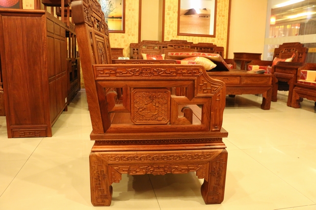 而今天,筆者要給大家介紹的這一款紅木家具沙發——福臨門沙發,正是一款為了表達人們這一初衷和愿望,用以其承載美好的向往和精神寄托的上等紅木沙發。該款沙發同樣采用的是福林堂紅木所擅長的優質緬花而制作,整體做工表現精良精湛,雕刻圖案豐富多樣,筆鋒縱橫飽滿有力,在沙發的正面,高幾、角幾各處以及小平幾的上方還刻畫了許多以昭示"福到"之意的優美圖畫圖案,古人們神話故事傳說中的宏偉事跡等,用手輕撫摸之,給人以身臨其境之感,畫面代入感極其強烈,可以感受到,那畫筆縱橫交錯的洶涌的海水,蜿蜒有秩形態各異的各種古器法寶圖案,還有那原木所自帶散發出來的淡淡的清香,古樸而讓人難以釋懷忘卻。